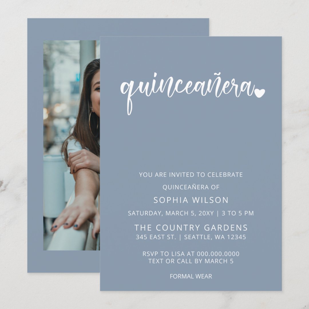 Dusty Blue Simple Script Quinceanera Photo Invitation | Zazzle
