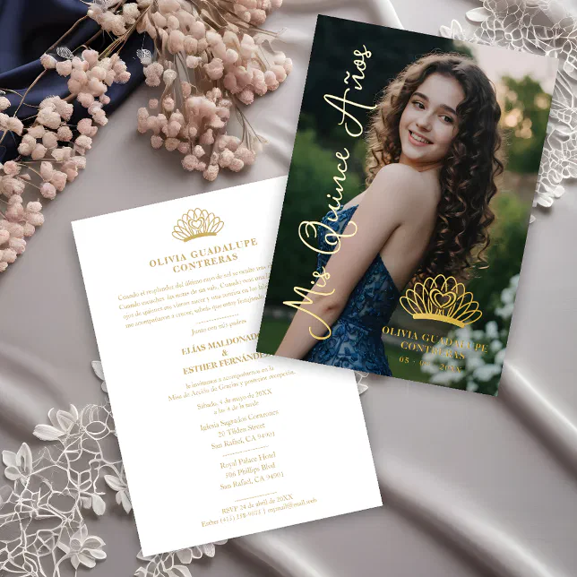 Exquisite Crown Quinceañera Photo Fancy Script Foil Invitation | Zazzle