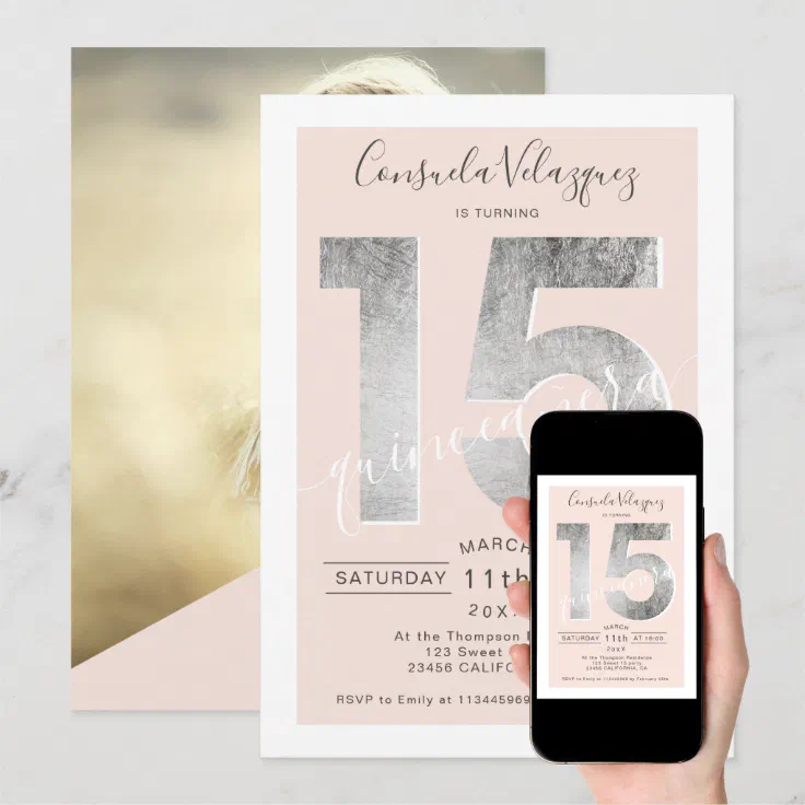 Silver foil script blush quinceanera photo invitation | Zazzle