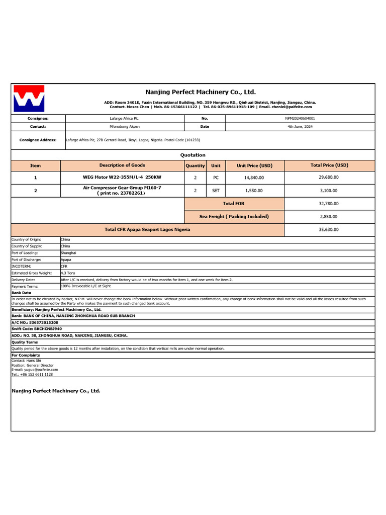 Quotation Lafarge Africa PLC, Nigeria WEG Motor and Air Compressor Gear ...