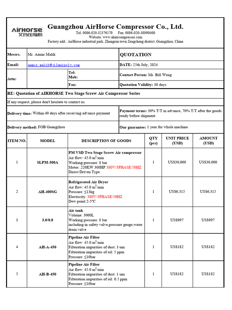 Quotation of AIRHORSE Two Stage Screw Air Compressor Series | PDF | Gas ...