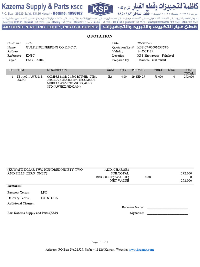 Quotation for Compressor Supply KSP | PDF