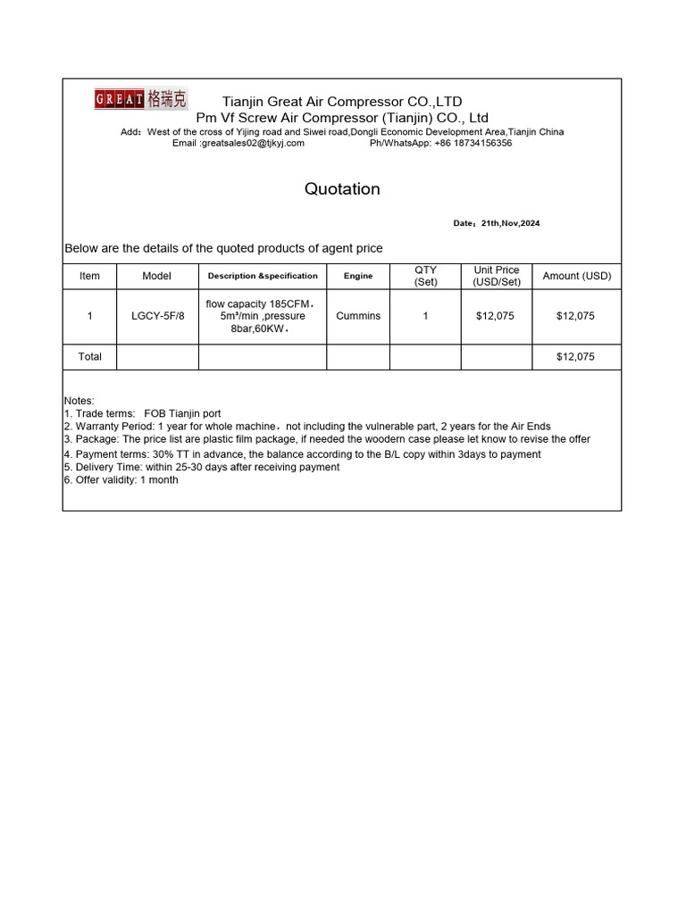 Tianjin Great Air Compressor Co.,Ltd Quotation 11.21 | PDF | Diesel ...