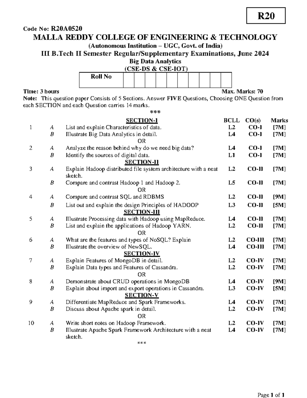 R20- Big Data Analytics - Page 1 of 1 Code No: R 20 A 0520 MALLA REDDY ...