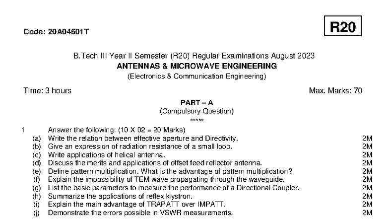 R20 Code: 20A04601T B.Tech II Sem (R20) Antennas & Microwave Engg Exam ...