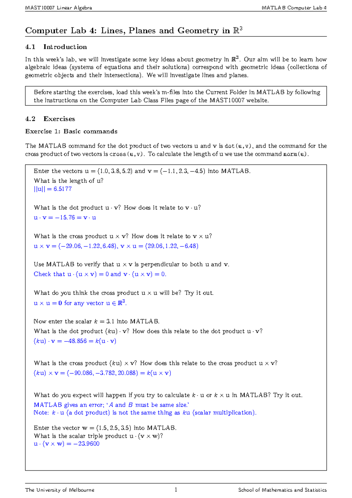 Linear Algebra MATLAB Lab 4: Lines, Planes & Geometry in R3 - Studocu