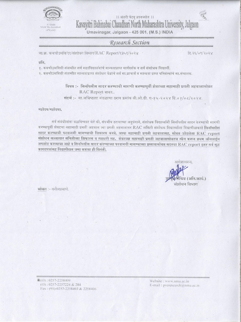 Format of RAC Report While Asking Permission For Submission of Synopsis ...