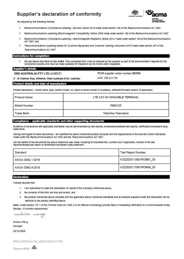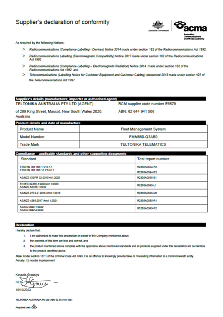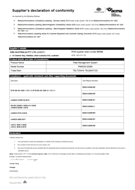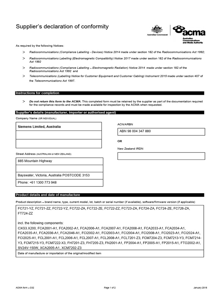 Australia Supplier's Declaration of Conformity (SDoC) & Regulatory ...