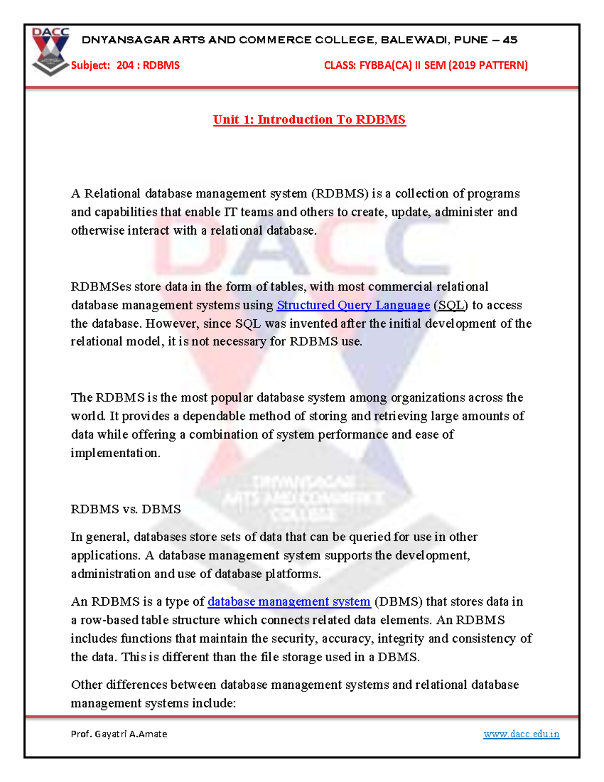 RDBMS Class Notes - FYBBA(CA) II Sem - Course 204 (2019 Pattern) - Studocu
