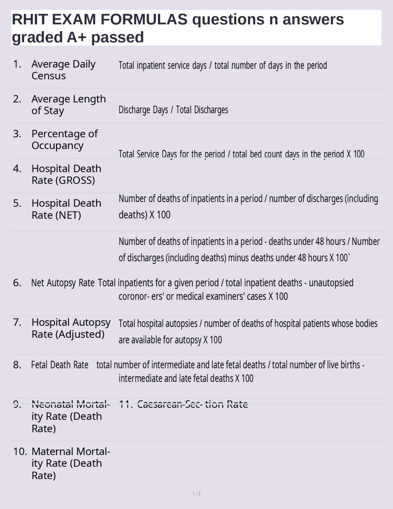 Hospital Statistics: Key Formulas for RHIT/RHIA Exams - Studocu