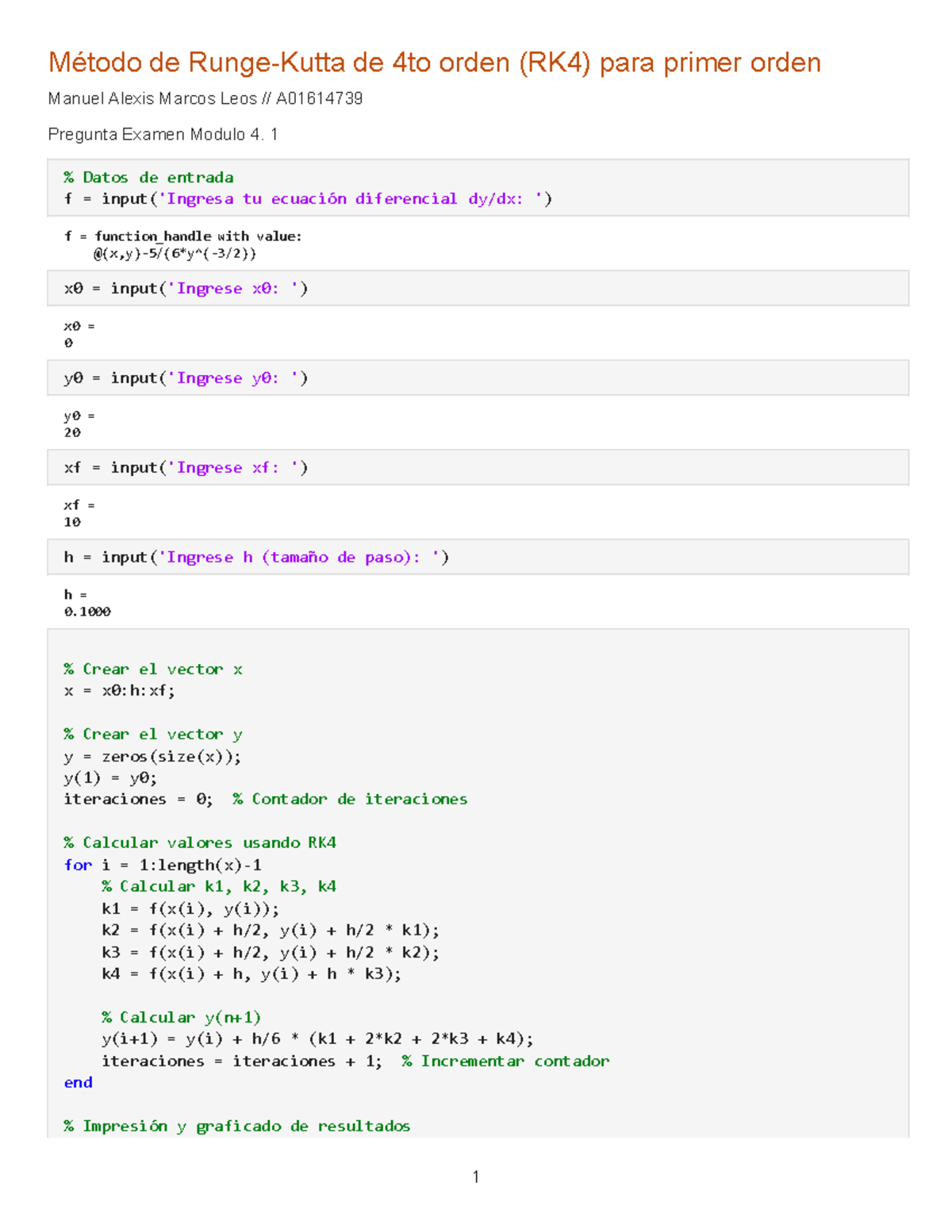 Método RK4 para Ecuaciones Diferenciales - Examen Matlab A01614739 ...