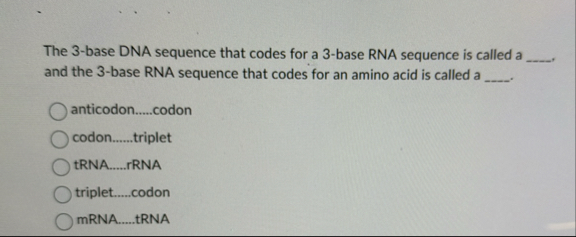 Solved The 3-base DNA sequence that codes for a 3-base RNA | Chegg.com