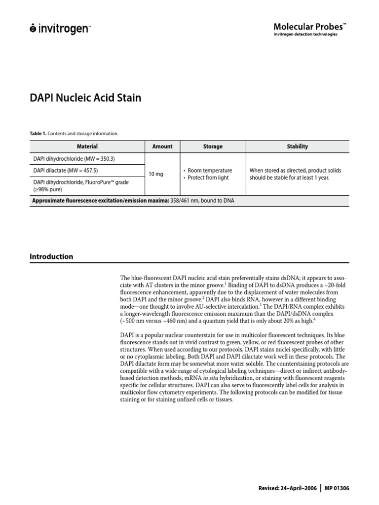 DAPI Nucleic Acid Stain: Material Amount Storage Stability | PDF | Dapi ...