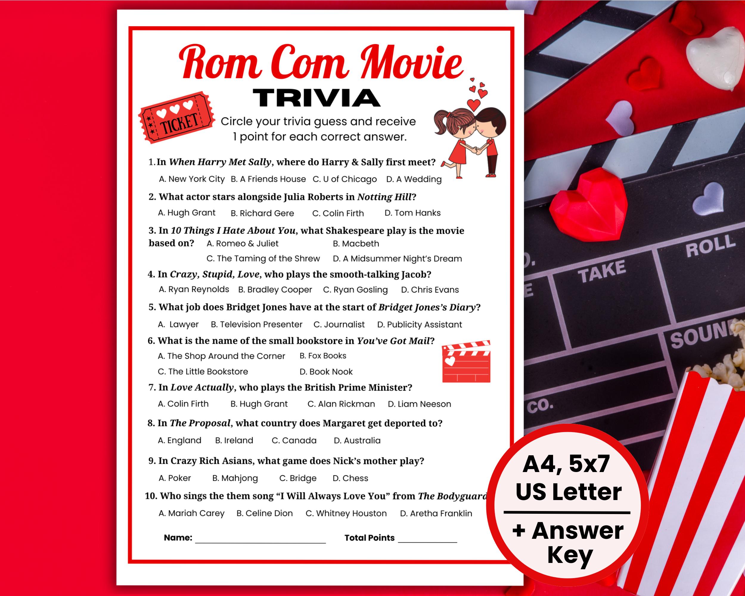 Rom Com Movie Trivia Quiz, Galentines Trivia, Romantic Comedy Trivia ...