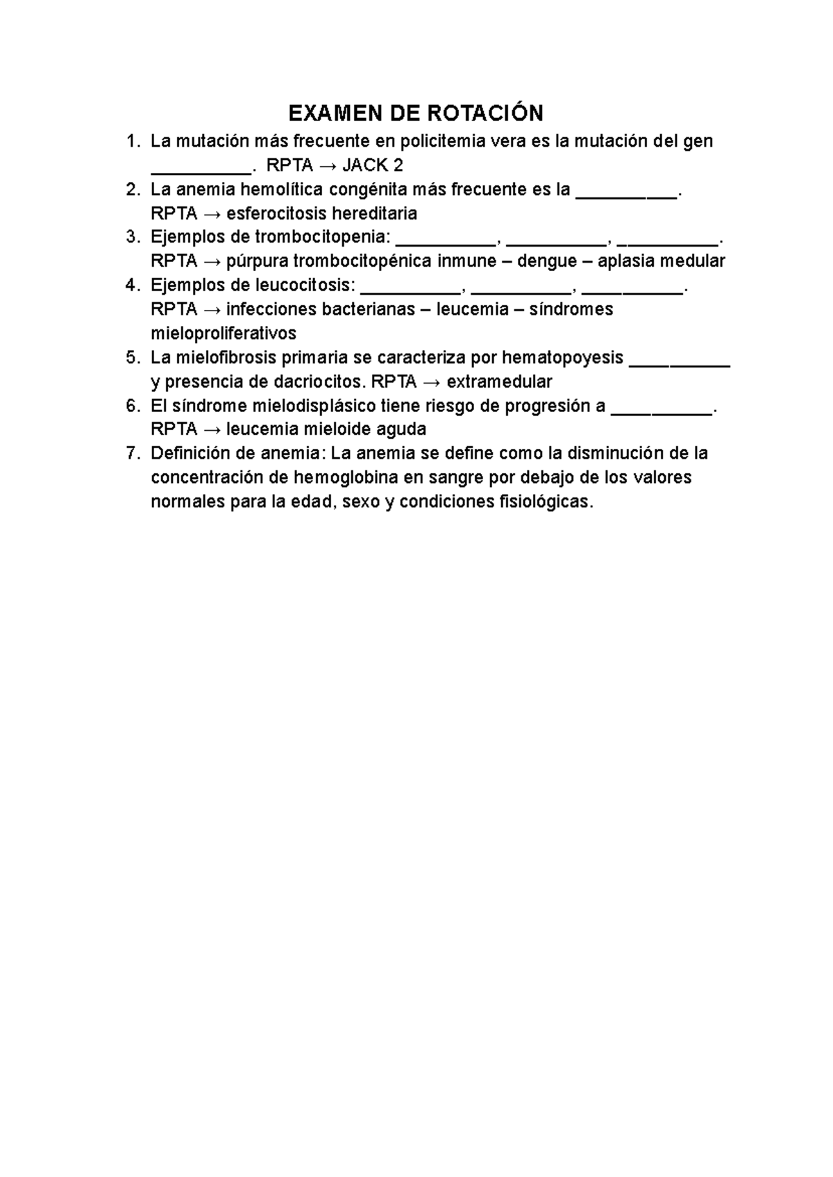 EXAMEN DE ROTACIÓN HEMATOLOGÍA: Mutaciones y Anemia - Studocu