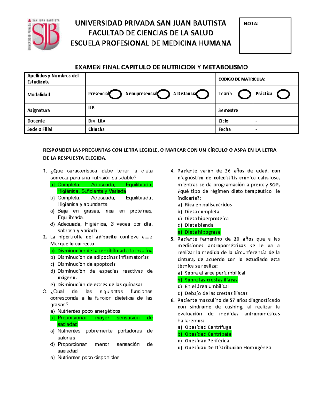 Examen Final ITR - Capítulo de Nutrición y Metabolismo - Studocu