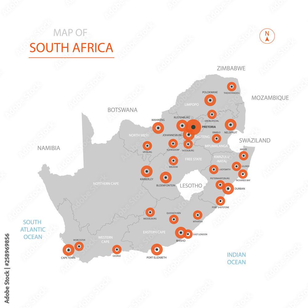 Stylized vector Republic of South Africa (RSA) map showing big cities ...