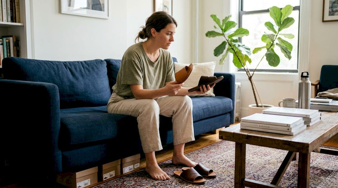 Woman picking slide sandals at home