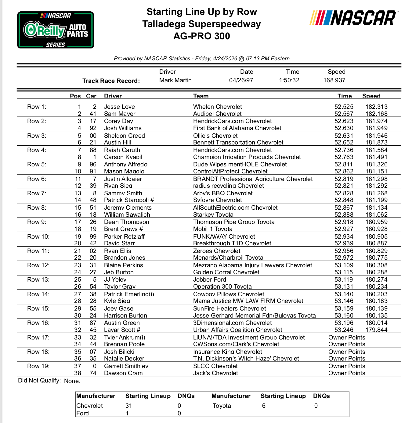 O'Reilly Series Talladega NASCAR Qualifying Results / Starting Lineup ...
