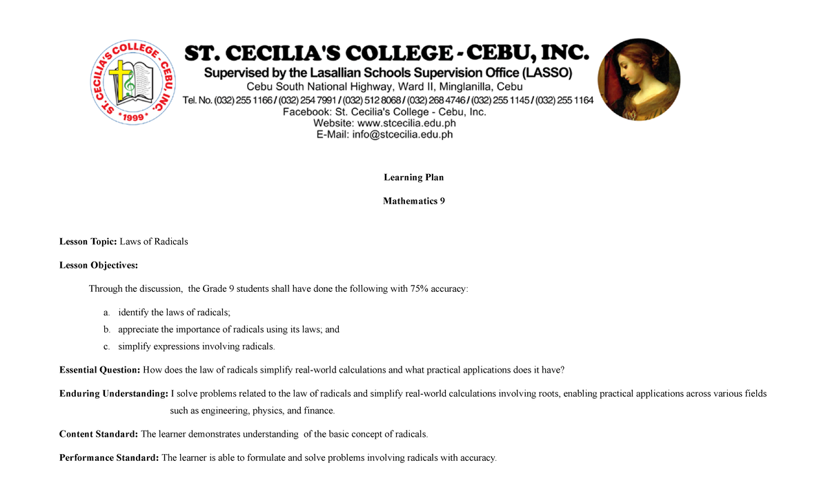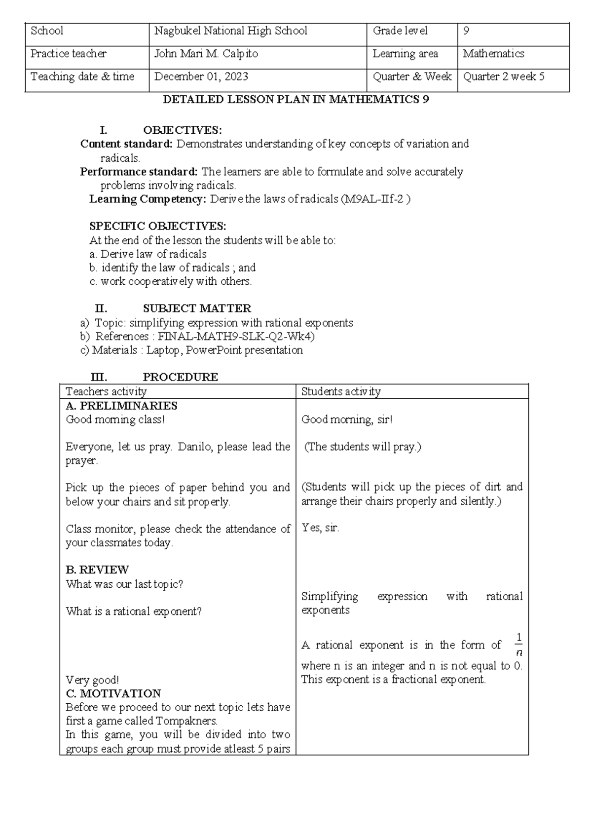 Law of radicals - lesson plan - DETAILED LESSON PLAN IN MATHEMATICS 9 I ...