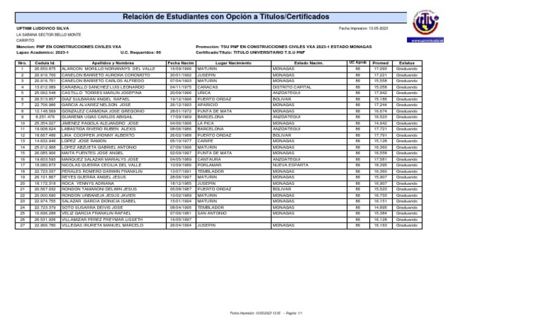 Listado de Graduando Oficial PNF Const Civiles Monagas 2023-1 | PDF