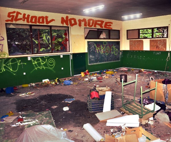 The image shows a classroom with green walls, vandalized with graffiti ...