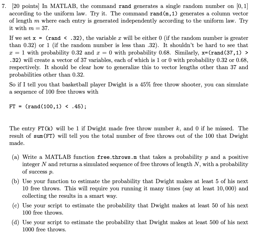 Solved 7. [20 points) In MATLAB, the command rand generates | Chegg.com