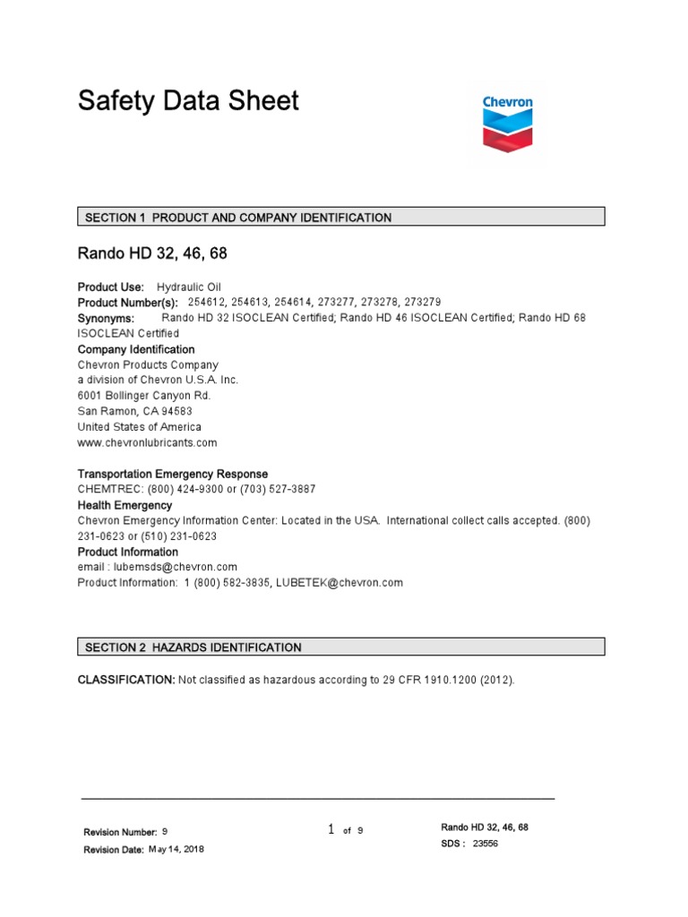 Safety Data Sheet for Rando HD Hydraulic Oils | PDF | Toxicity ...