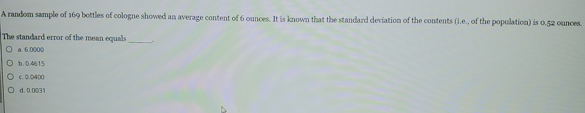Solved A random sample of 169 bottles of cologne showed an | Chegg.com