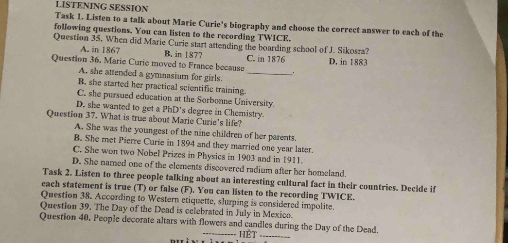 Giải quyết:LISTENING SESSION Task 1. Listen to a talk about Marie Curie ...
