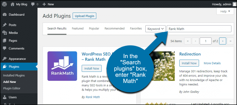 Installing Rank Math Plugin Through the WordPress Admin Panel