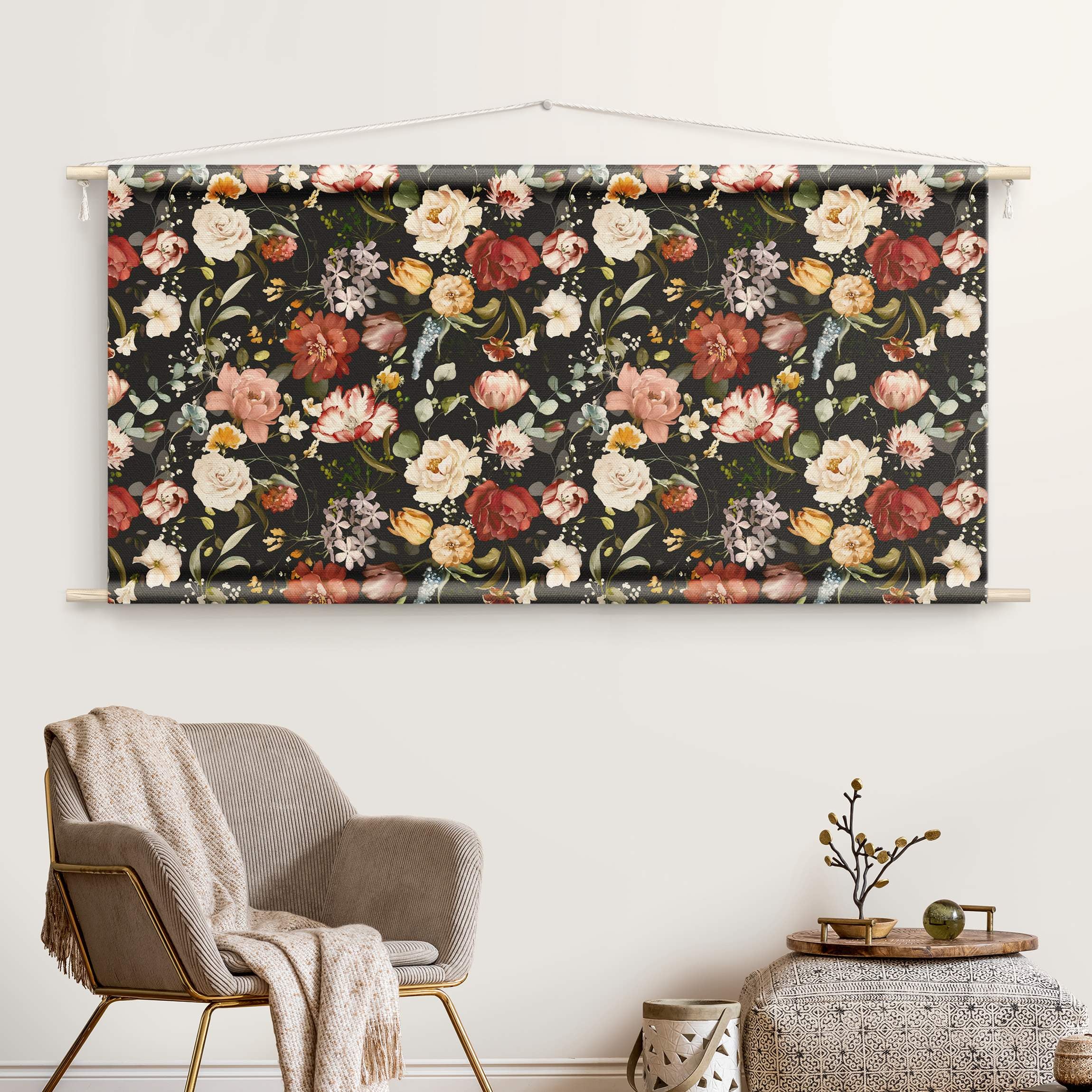 Tapiz - Flowers Watercolour Vintage Pattern on Black 278 x 139 cm ...