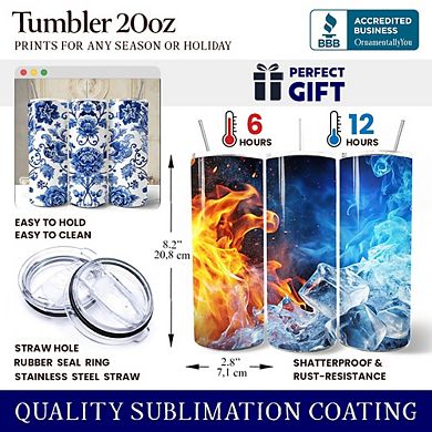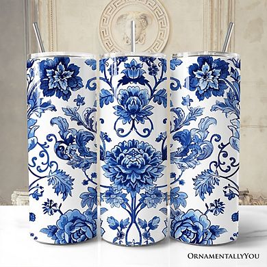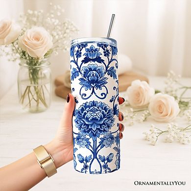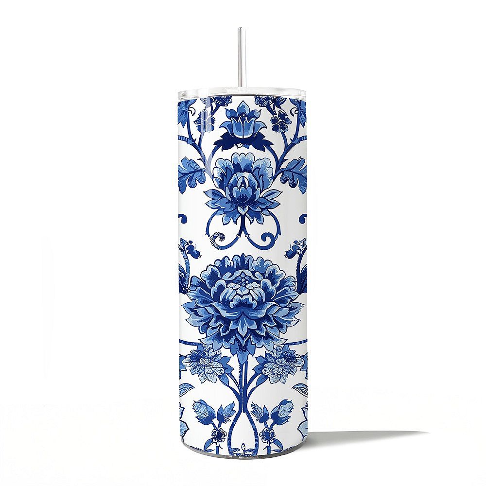 Blue and White Floral Pattern 20oz Tumbler With Lid and Stainless Steel ...