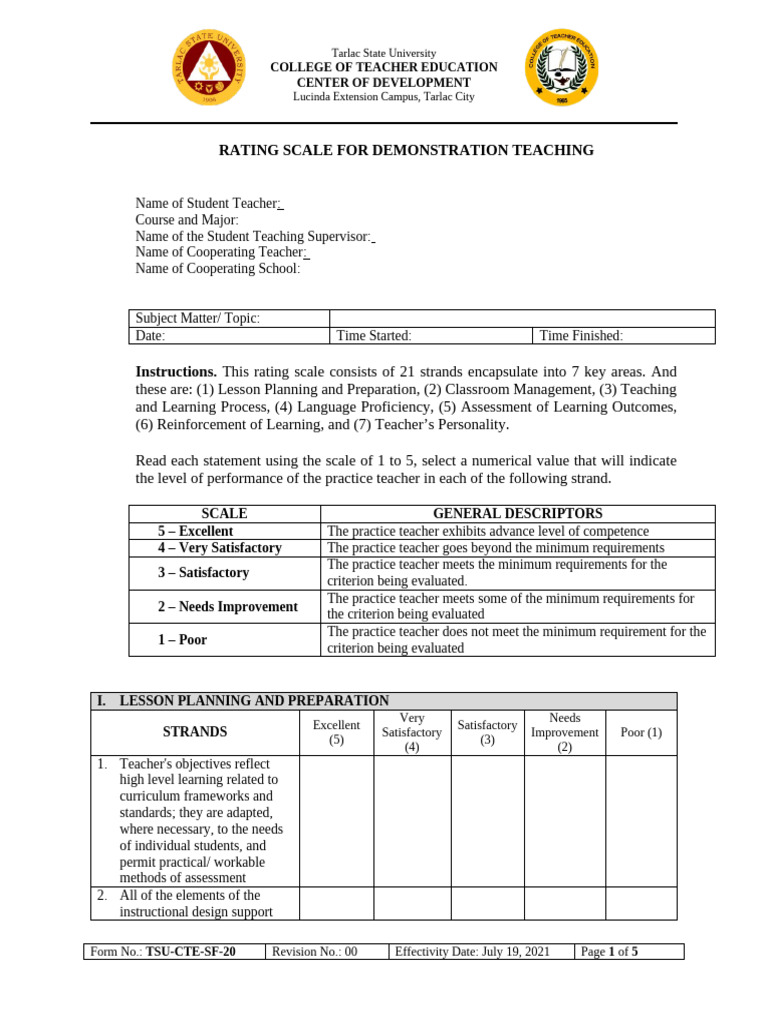 Rating Scale For Demonstration Teaching | PDF | Teachers | Learning