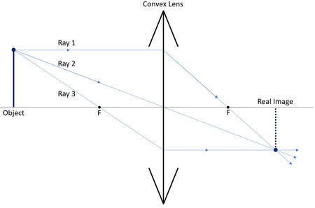 Physics diagram showing a ray diagram for a convex lens with an object ...
