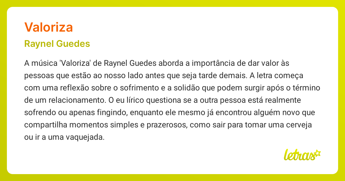 Significado da música VALORIZA (Raynel Guedes) - LETRAS.MUS.BR