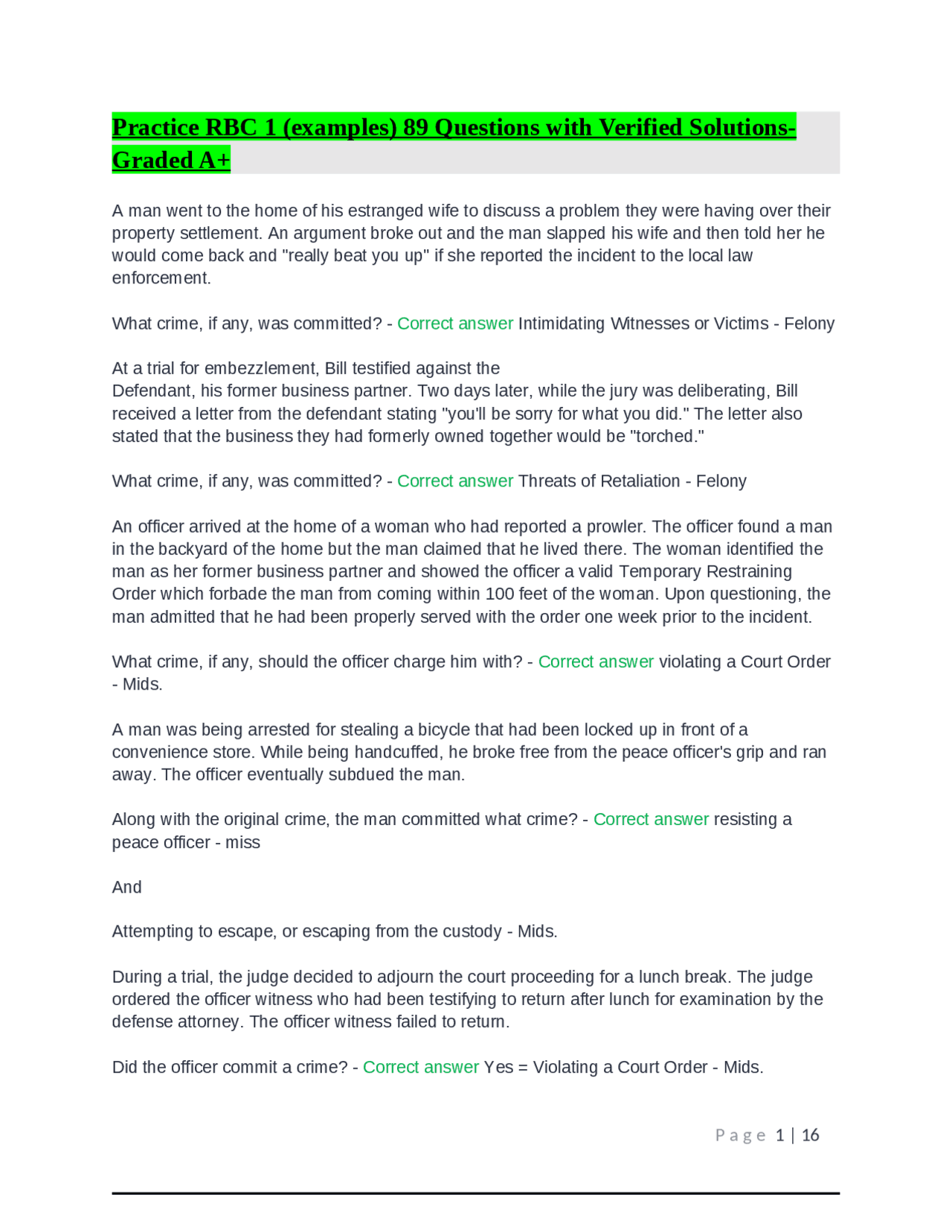 Practice RBC 1 (examples) 89 Questions with Verified Solutions-Graded ...