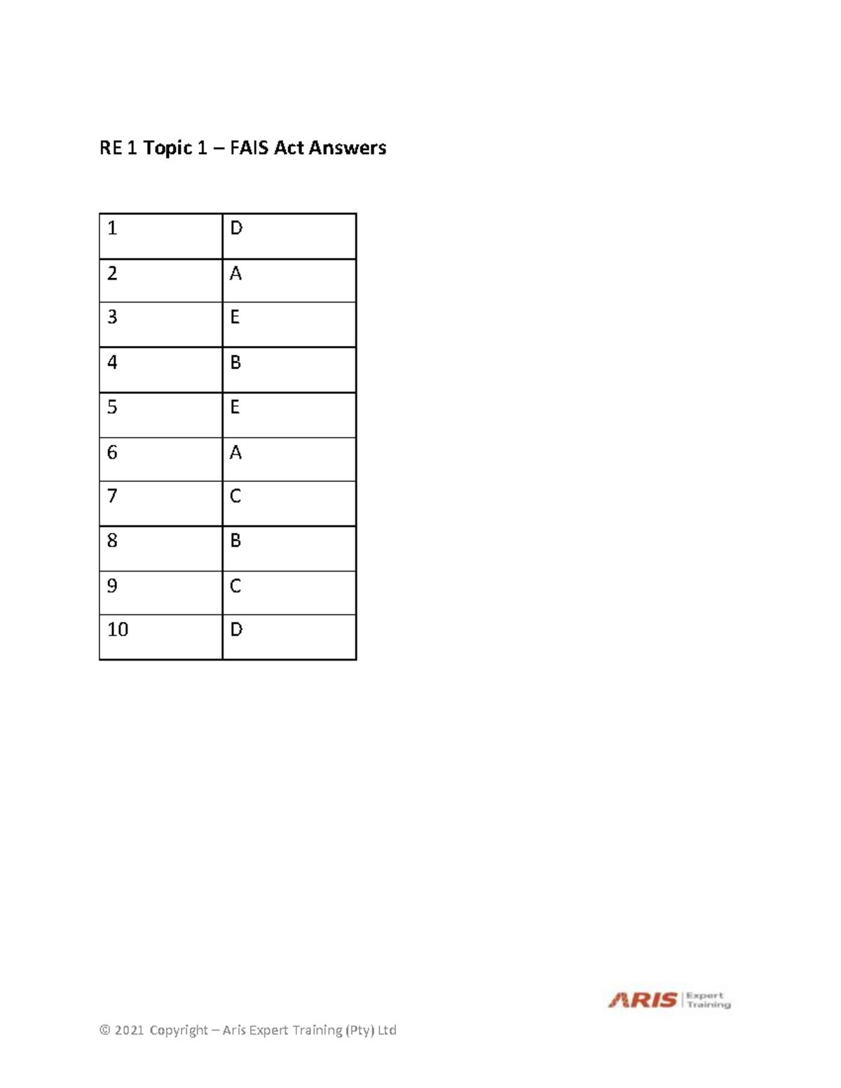 RE 1 Answer guideline - notes - RE 1 Topic 1 – FAIS Act Answers 1 D 2 A ...