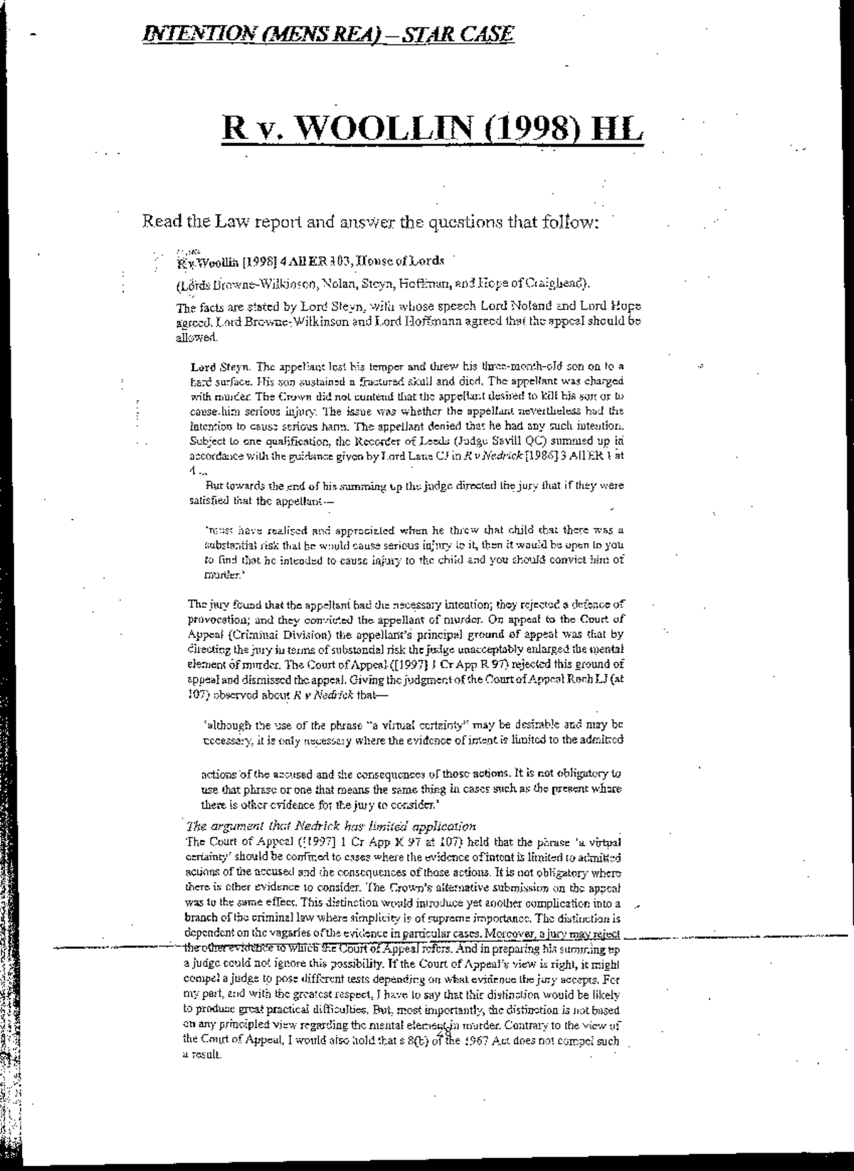 INTENTION (MENS REA) IN R v. WOOLLIN (1998) HI - Case Analysis - Studocu