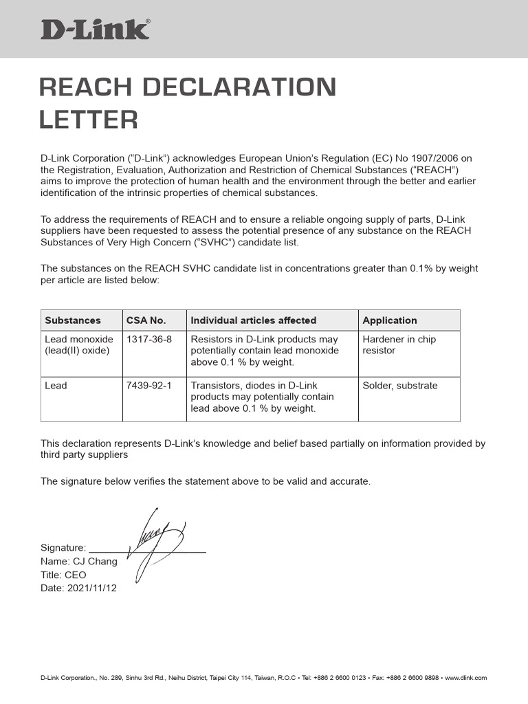 Dlink Reach Declaration Letter PDF | PDF