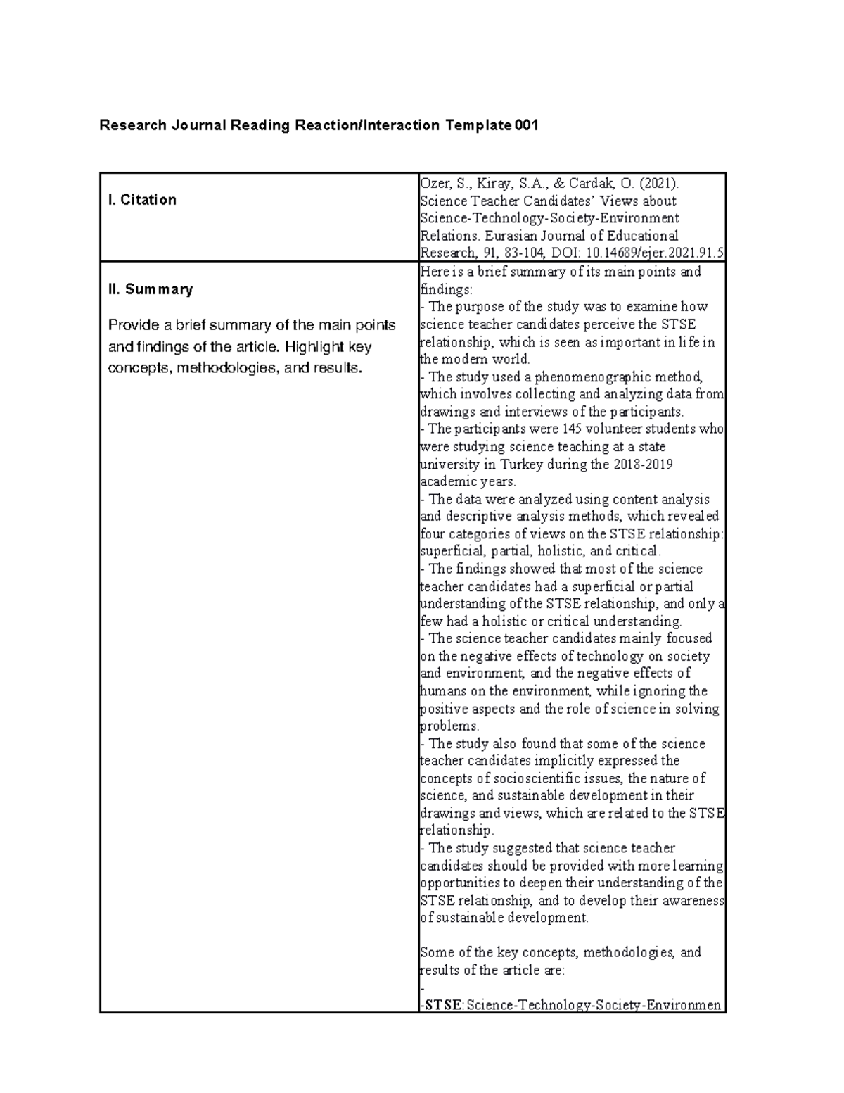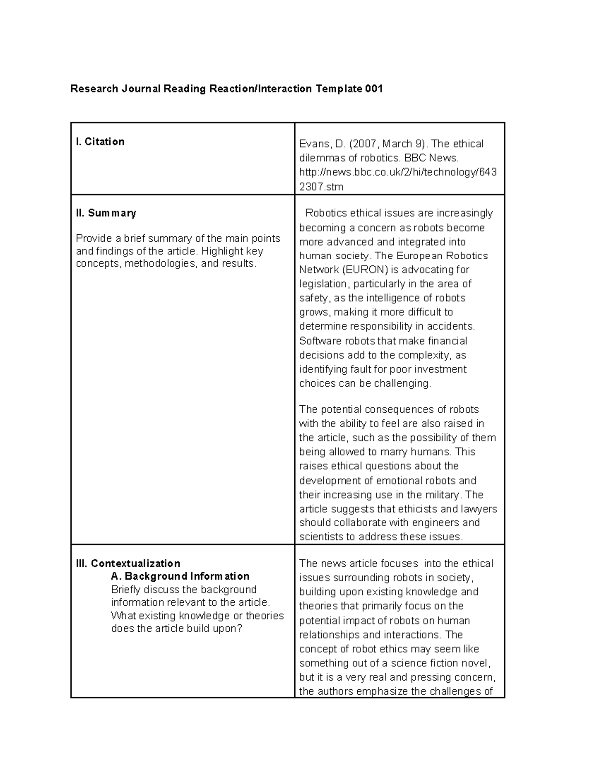 Research Journal Reading Reaction Interaction Template 001 - Citation ...