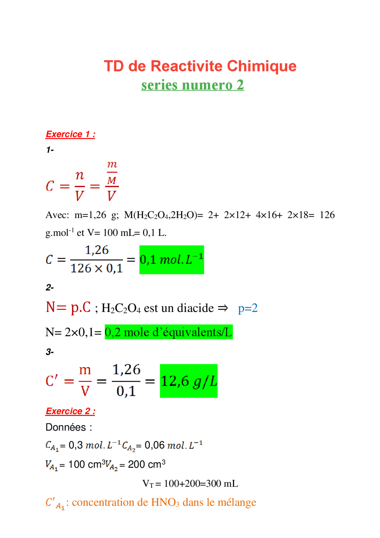 TD2 de reactivité chimique avec la solution | Exercices Chimie ...