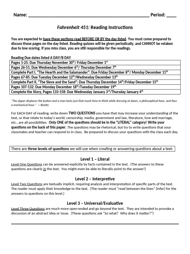 Summer Reading Packet - 4 Weekly Assignments - Readings + Questions ...