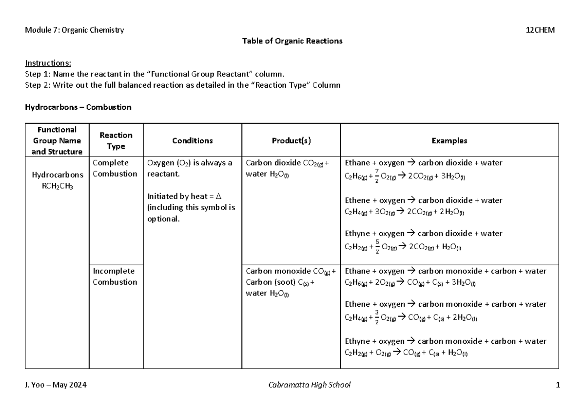 Table of Organic Reactions - Table of Organic Reactions Instructions ...