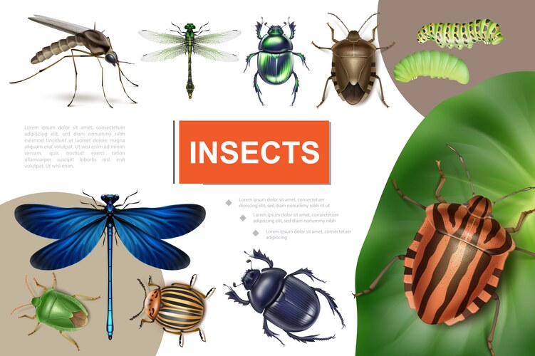 Realistic insects colorful template with dragonflies colorado potato ...