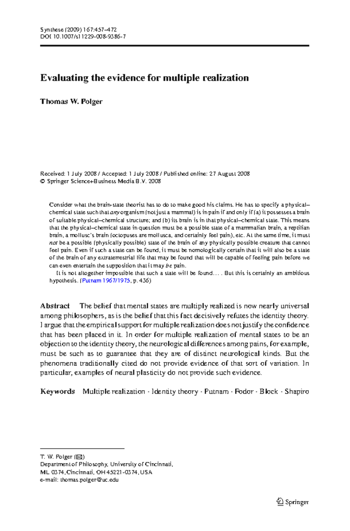 Evaluating the Evidence for Multiple Realization in Philosophy (PHIL ...