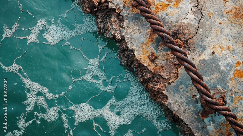 Rusty rebar exposed in cracked concrete of harbor bridge reflecting ...