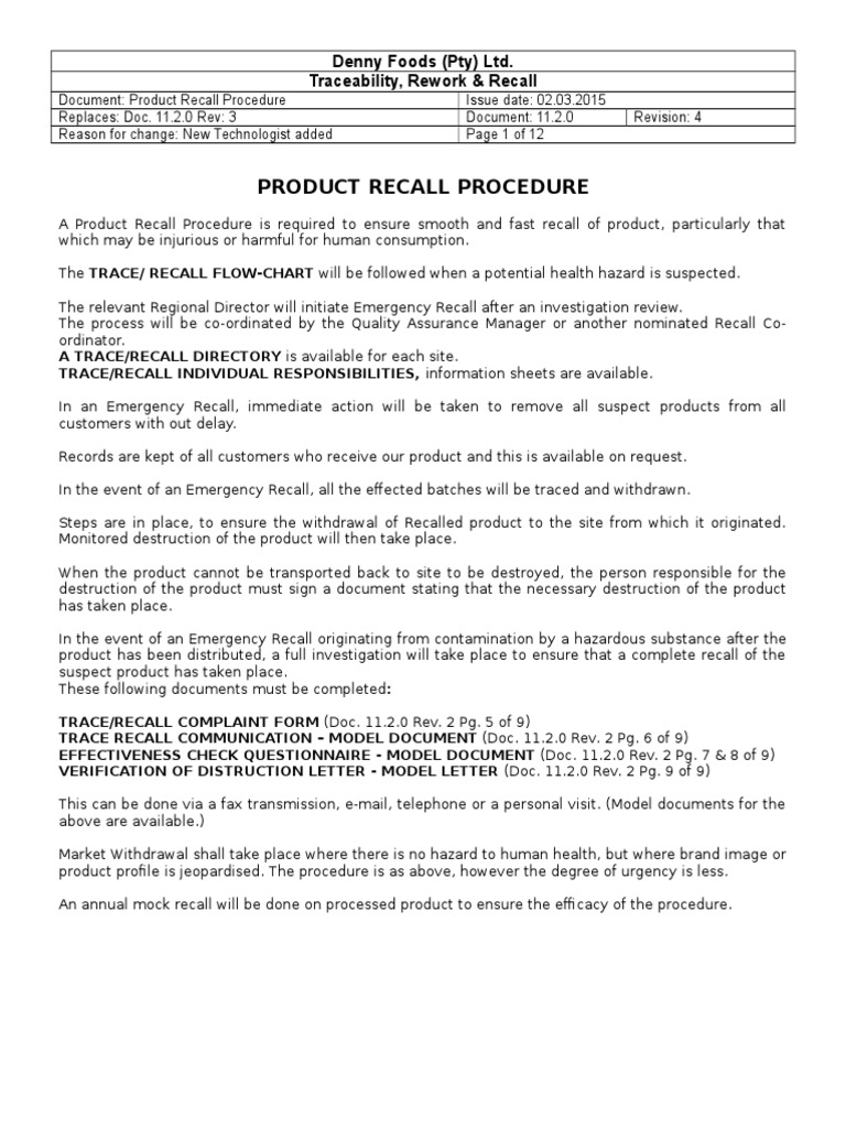 Product Recall Procedure Template Word