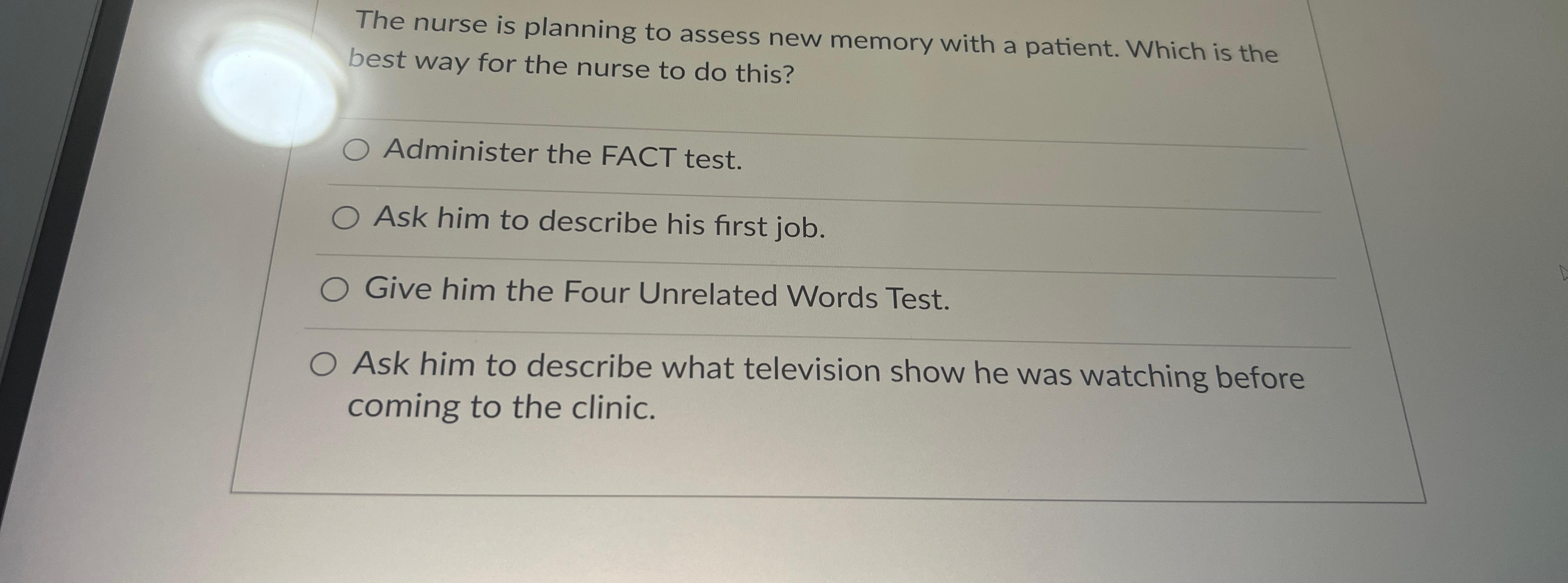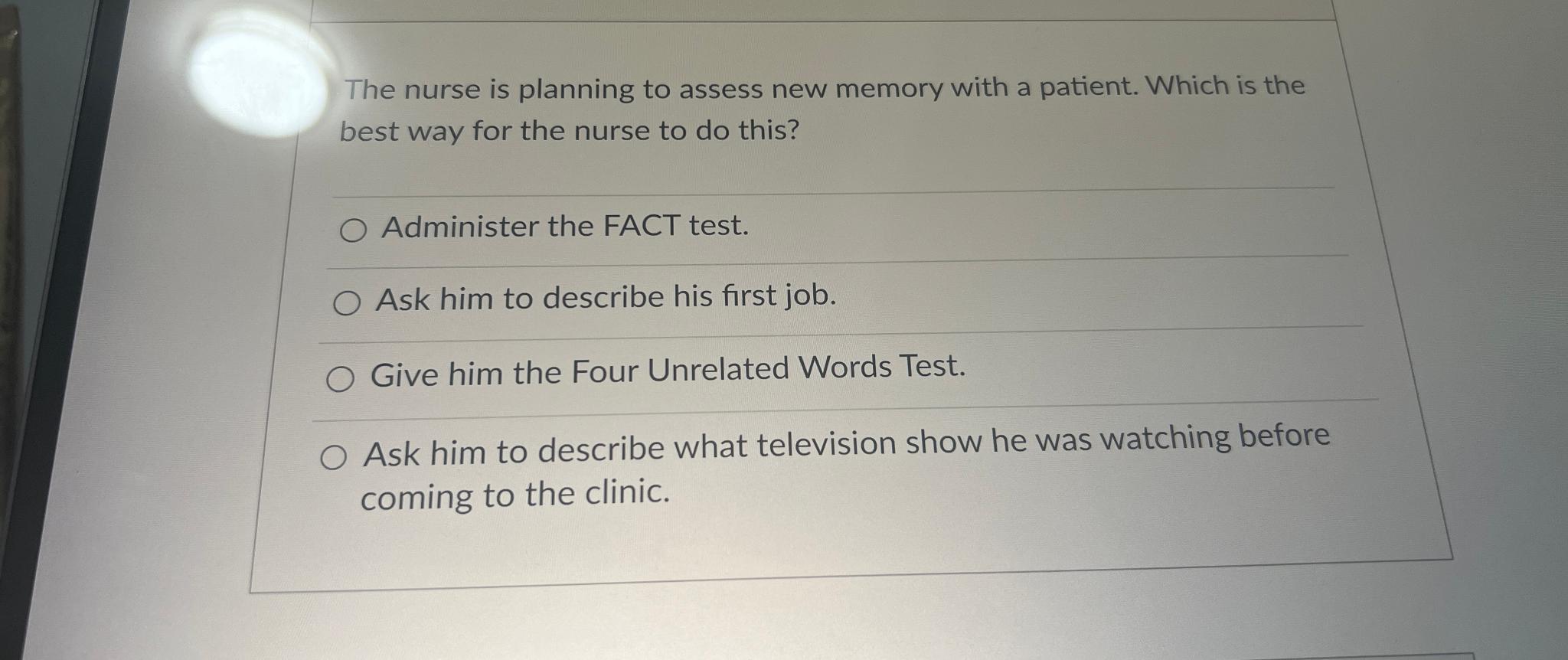 Solved The nurse is planning to assess new memory with a | Chegg.com