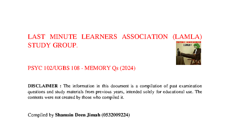 PSYC 108 - Memory Questions Compilation for LAMLA Study Group - Studocu